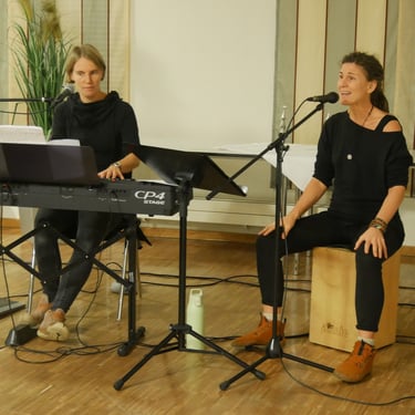 „Zur DFG kommen ist wie Nachhause-Kommen“, so beginnt das Duo a.mie den Abend, der das Programm der Deutsch-Französischen Gesellschaft in diesem Jahr abschließen soll. Die beiden Musikerinnen erinnern an ihre Anfänge und daran, dass die beiden durch die Anfrage der DFG ihre Liebe zu französischen Liedern entdecken ließ.