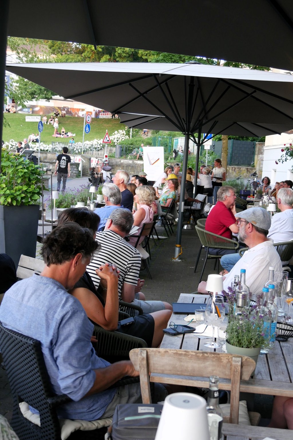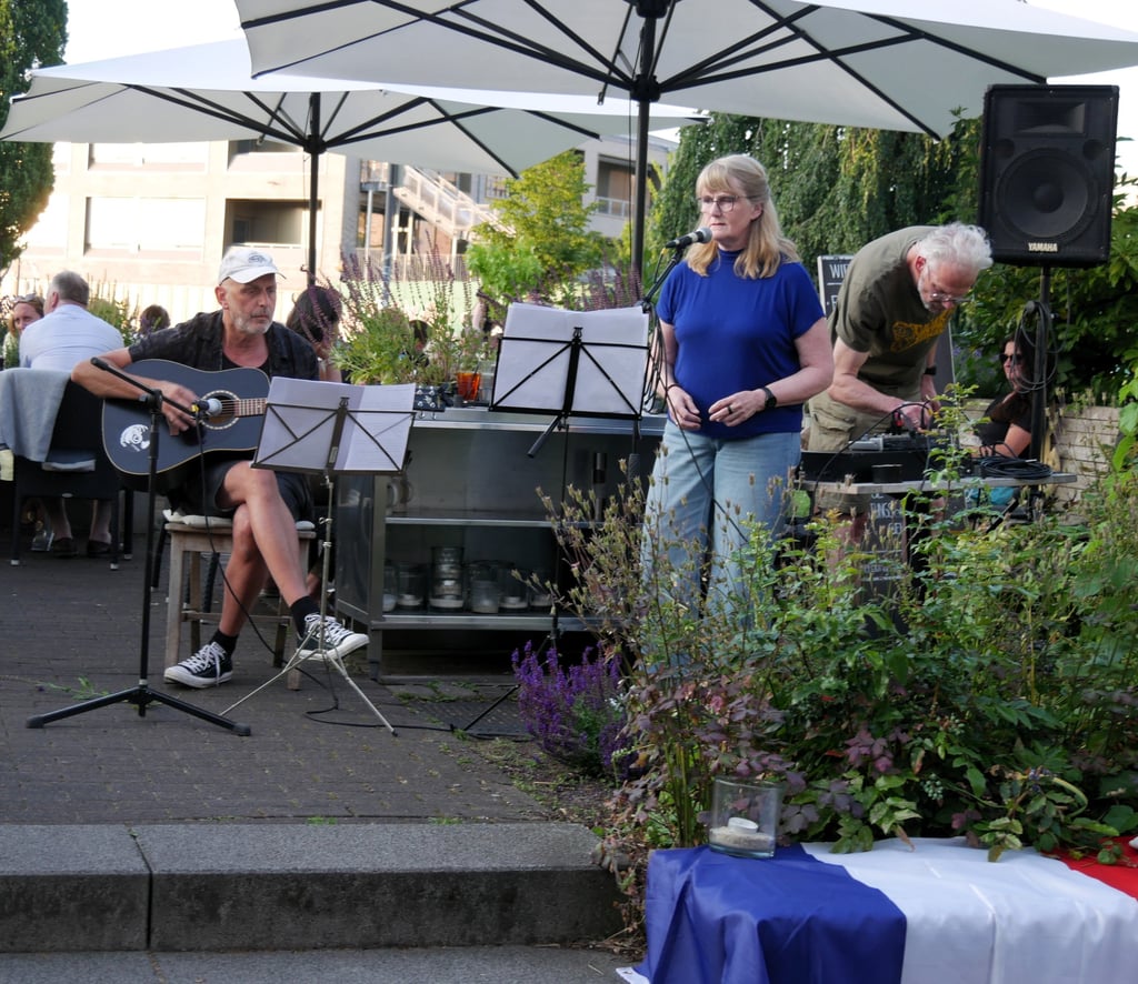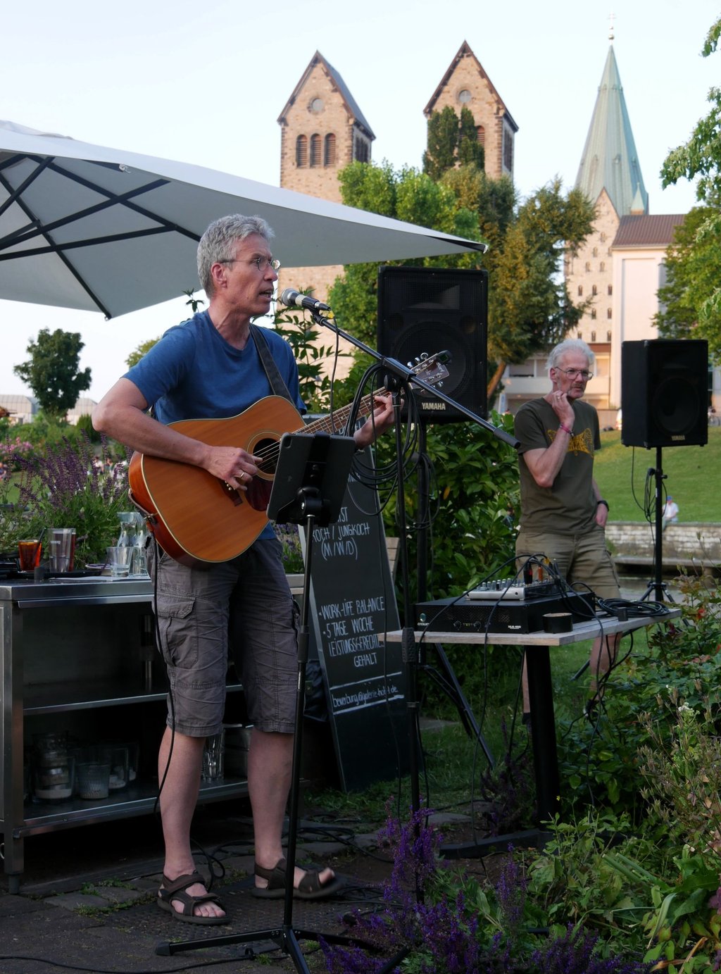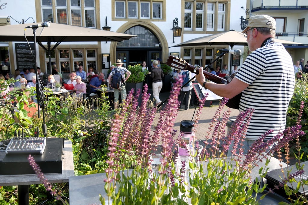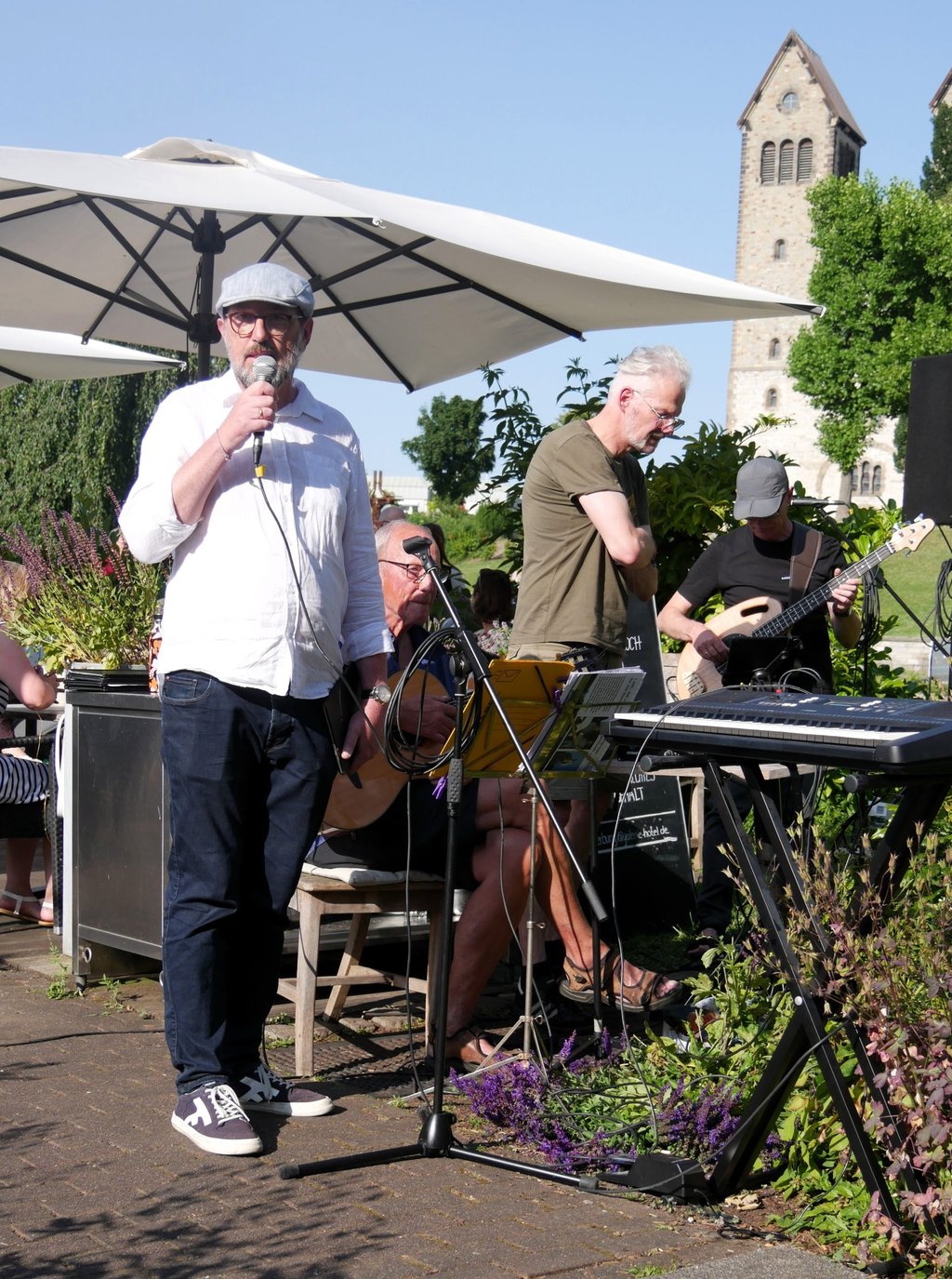 Nach einem heißen Sommertag folgte ein lauer Sommerabend – wie gemacht für die alljährlich stattfindende Fête de la Musique organisiert von Sylvain Victor von der Deutsch-Französischen Gesellschaft Paderborn. Schnell waren die Plätze auf der Terrasse der Petite Galerie besetzt, viele setzten sich auf die Mauer oder hörten stehend zu.
