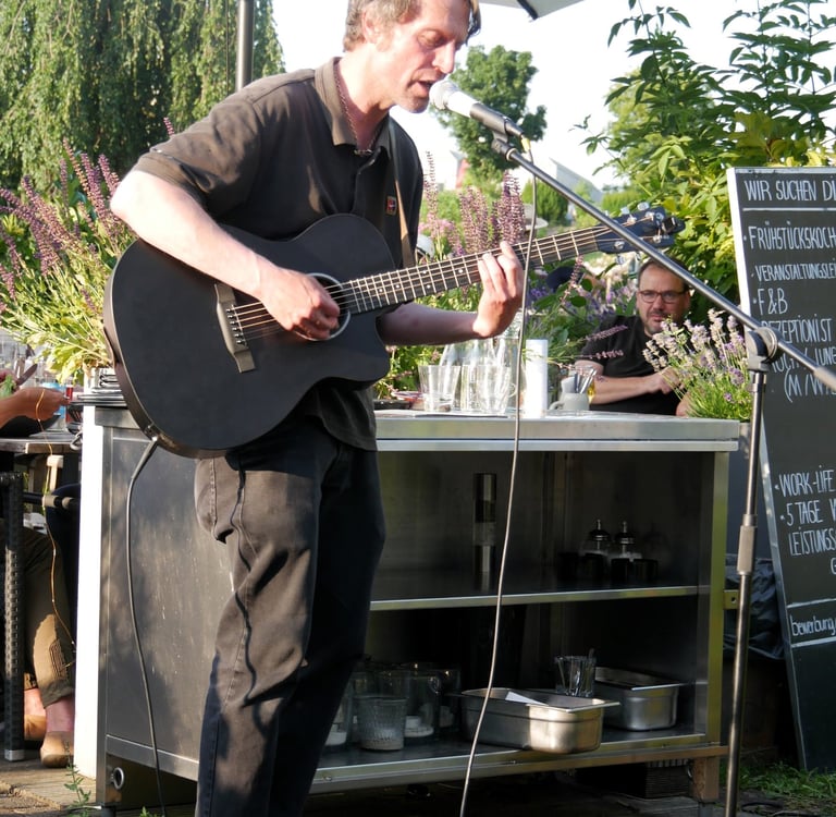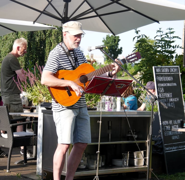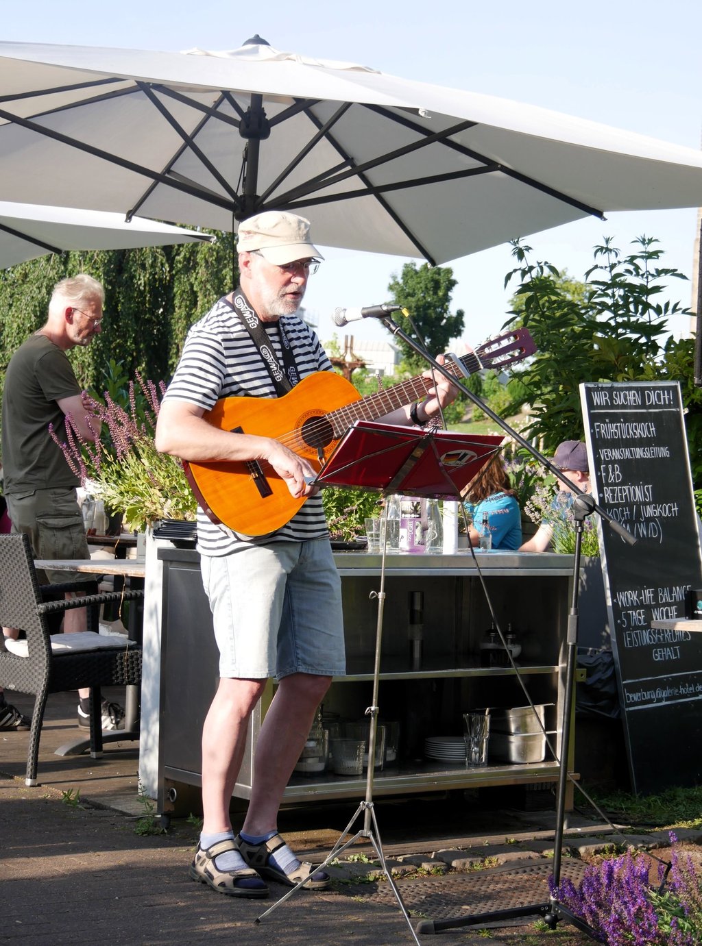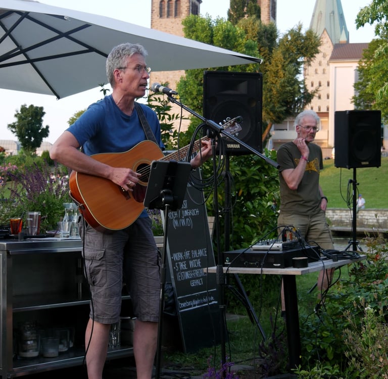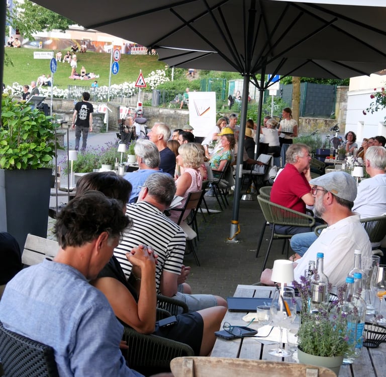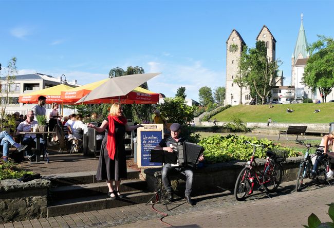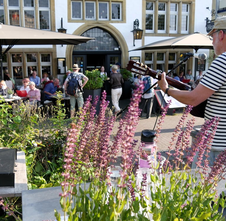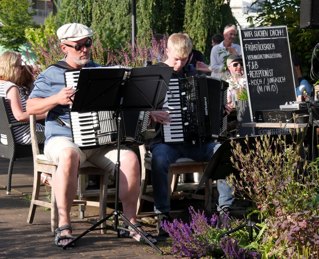 Nach einem heißen Sommertag folgte ein lauer Sommerabend – wie gemacht für die alljährlich stattfindende Fête de la Musique organisiert von Sylvain Victor von der Deutsch-Französischen Gesellschaft Paderborn. Schnell waren die Plätze auf der Terrasse der Petite Galerie besetzt, viele setzten sich auf die Mauer oder hörten stehend zu.
