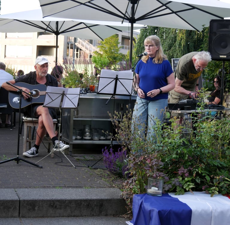Das Programm wurde eröffnet mit der Gruppe ‚Blauer Heinrich‘ rund um Klaus Schüssler. Die Gruppe singt ‚Klassiker‘ auf Deutsch und ist auf den Geschmack gekommen, auch französische Chansons auf Deutsch zu singen. Weiter ging es mit Sonnenröschen, begleitet von Marlène Victor an der Geige mit verspielten Texten. Typisch französisch klangen die beiden Akkordeonisten Rolf Meinigke und Cedric Hartz, sowie Stefan Balthasar, der französische Lieder zum Mitsingen präsentierte. Weiterhin dabei waren der Chor ‚Chor & More‘, die Tanzgruppe der Lebenshilfe Dance 4 Fans (von der Tantzschule Möllmann), der Songschreiber, Sänger und Gitarrist Matze Nagel, gefolgt von Uta Becker, begleitet an der Gitarre von Jürgen Hessel und der Songwriter Andreas Hörstmann.