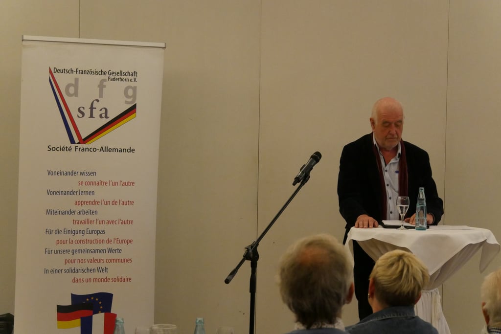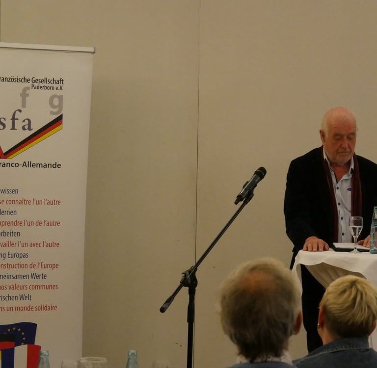 Am Mittwoch, dem 7. Mai erinnerte der Historiker und Publizist Dr. Volker Jakobs an den 2. Weltkrieg, dem über 60 Millionen Menschen zum Opfer fielen und viele Geflüchtete und Verwundete zur Folge hatte. Er verdeutlichte den Unterschied zum 1. Weltkrieg und betonte, dass dies nicht nur ein Eroberungs-, sondern auch ein Vernichtung-, Weltanschauungs- und Rachekrieg war. Er verwies darauf, dass Hitlers „Germany first“ an Aktuelles erinnert und dass überall auch in Europa derzeit ähnliche Entwicklungen zu beobachten sind. Immer wieder betonte er den Vers aus dem Alten Testament „Wer Wind sät, wird Sturm ernten“.
